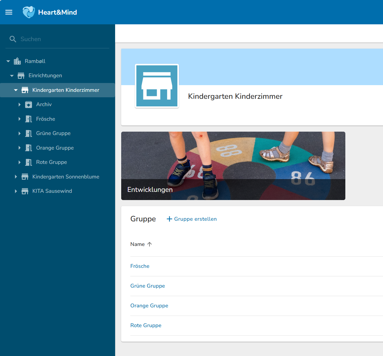 Eine weitere Funktion auf Gruppen- und Trägerebene ist die aggregierte Darstellung von Gruppen- und Einrichtungsentwicklungen ausgehend von den individuellen Entwicklungsständen. Dadurch eignet sich Heart&Mind auch als Anstoß für Reflexion, Steuerung und Monitoring für Leitungen. Heart&Mind ermöglicht Qualität der pädagogischen Arbeit durch systematische Dokumentation, die ins Handeln bringen und die Wirkung der ergriffenen Maßnahmen nachvollziehbar macht.